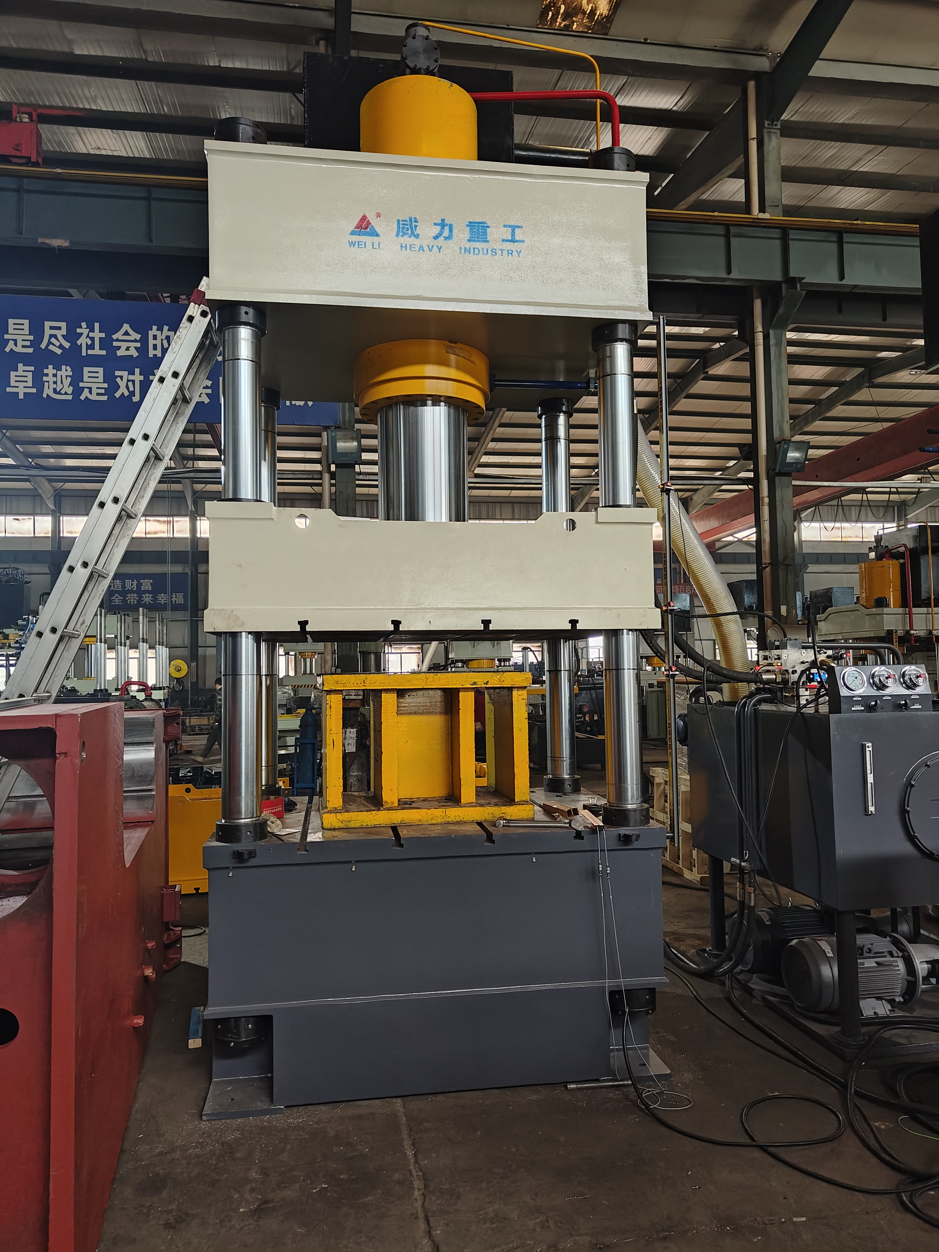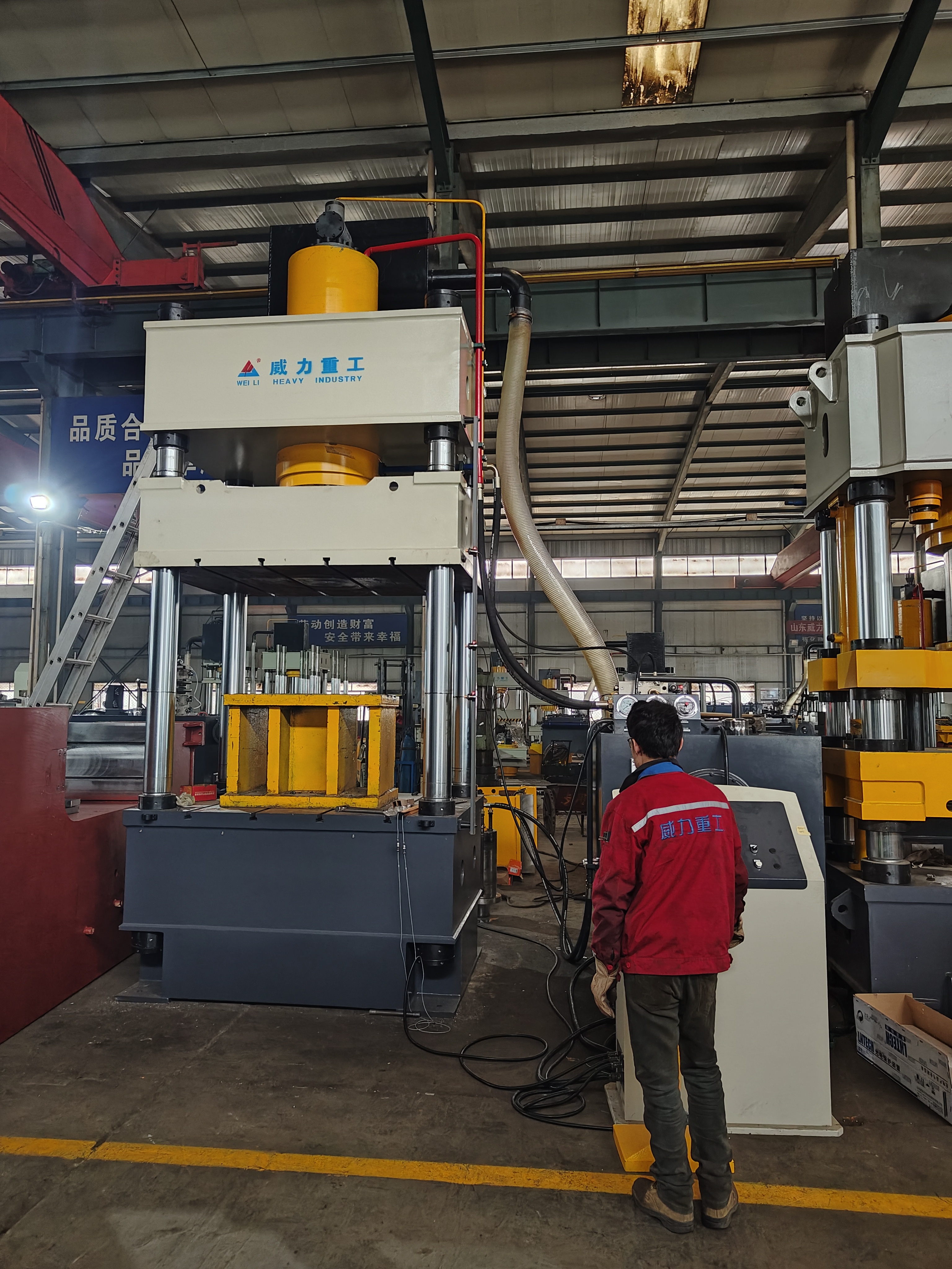 【產(chǎn)品描述】:500噸三梁四柱常規(guī)液壓機(jī) 是一種利用液體壓力進(jìn)行工作的機(jī)械裝置,廣泛應(yīng)用于各種工業(yè)領(lǐng)域。而500噸三梁四柱常規(guī)液壓機(jī)則是一種大型的液壓機(jī),通常用于重型工業(yè)和制造業(yè)中的各種壓制和成型工藝。 該液壓機(jī)的主要結(jié)構(gòu)包括三個(gè)主梁和四個(gè)柱子,以及一些其他重要的部件,如油缸、工作臺(tái)、壓力控制器等。這些部件協(xié)同工作,使液壓機(jī)能夠?qū)崿F(xiàn)各種不同的壓制和成型操作。
