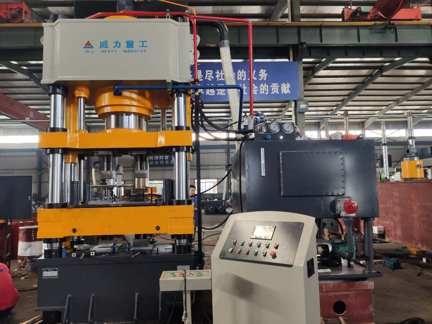 四梁四柱粉末壓塊液壓機(jī)的工作原理主要是利用液壓力將粉末壓制成所需形狀的塊體。當(dāng)液壓缸通入高壓油時,滑塊帶動壓頭下降,對粉末進(jìn)行壓制。壓制過程中,通過調(diào)整壓力和壓制時間,可以實(shí)現(xiàn)對塊體密度、強(qiáng)度等性能的控制。壓制完成后,頂出機(jī)構(gòu)將塊體頂出,完成一個工作循環(huán)。