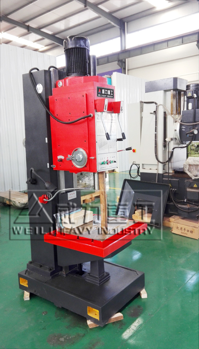 【產(chǎn)品描述】:立式鉆床 主軸豎直布置且中心位置固定的鉆床,簡稱立鉆。常用于 機械制造和修配工廠加工中、小型工件的孔。 立式鉆床加工前,須先調(diào)整工件在工作臺上的位置,使被加工孔中心線對準(zhǔn)刀具軸線。加工時,工件固定不動,主軸在套筒中旋轉(zhuǎn)并與套筒一起作軸向進(jìn)給。工作臺和主軸箱可沿立柱導(dǎo)軌調(diào)整位置,以適應(yīng)不同高度的工件。 立式鉆床作為鉆床的一種,也是比較常見的